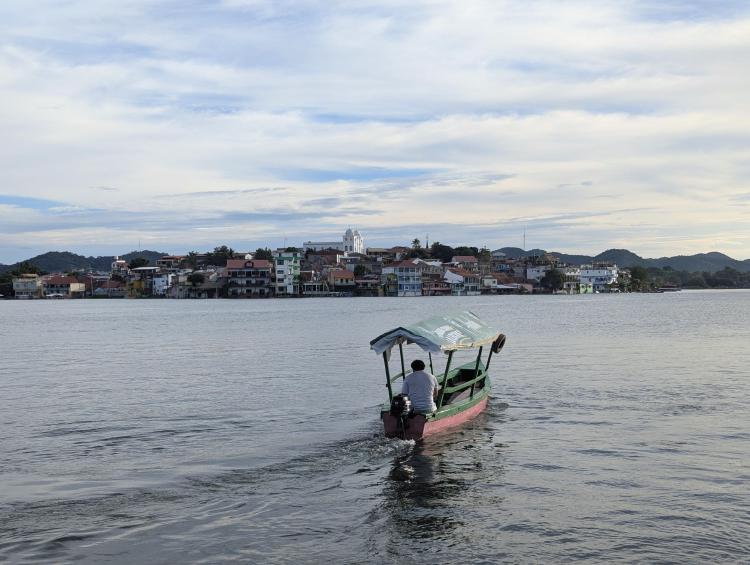 Wir schlenderten bei strahlendem Sonnenschein durch die Gässchen von Flores und bestiegen den Hügel mit der Kirche in der Mitte der Insel. Da die Rückfahrt nach El Remate per Boot zu teuer und weit gewesen wäre, entschieden wir uns für eine Rundfahrt über den See. Die bunten Häuschen der Insel leuchteten geradezu in der langsam untergehenden Sonne. Der junge Bootsführer entpuppte sich als leidenschaftlicher Reiseführer und erzählte uns Legenden aus der Region. Er gab uns Tipps für den schönsten Badestrand am See, und berichtete uns vom traditionellen Fischfang.