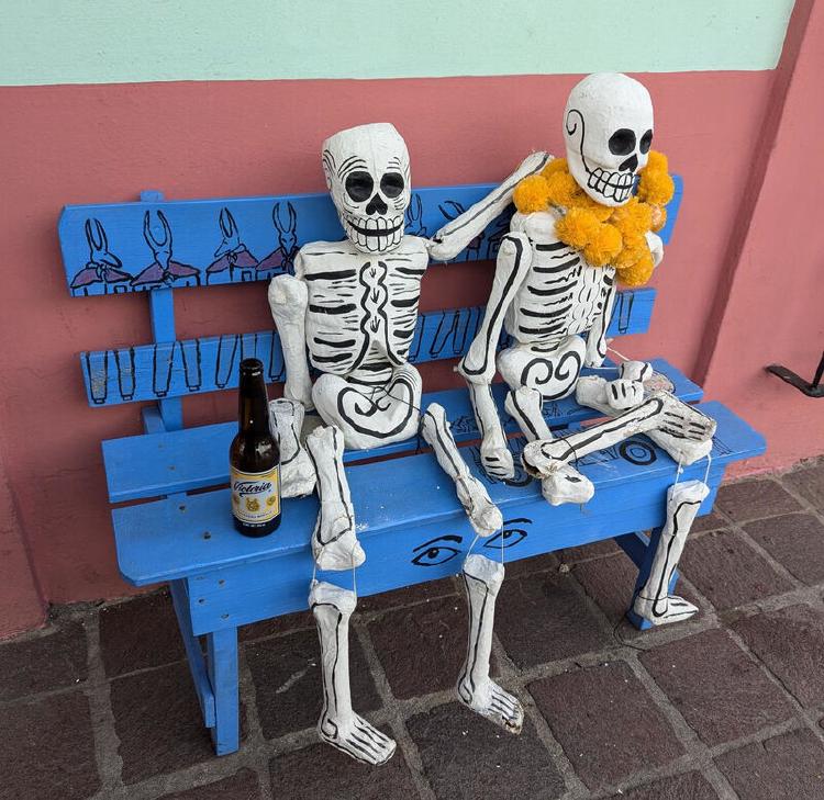 Wir schliefen aus und winkten dann am Nachmittag eines der Colectivo Taxis heran. Diese Taxis verkehren auf groben Linien und werden mit bis zu 5 (ja, nicht vier) Passagieren gefüllt, die in die gleiche Richtung müssen. 30 Pesos und 10min später stiegen wir an einer Hauptstrasse aus und suchten den Zócalo, den Hauptplatz. Dort war schon vieles für den Tag der Toten dekoriert: Riesige Skelette, Ofrendas (eine Art geschmückter Altar mit Opfergaben für die verstorbenen Familienangehörigen) und mit Cempasúchil oder Studentenblumen geschmückte Türrahmen. In den riesigen Menschenmassen fand uns Nadina (eine Freundin aus der Schweiz, die mit einer Reisegruppe hier war) dank dem geteilten Standort ziemlich schnell. Mit ihr wollten wir uns einen Umzug anschauen. Die Teilnehmenden sind verkleidet, spielen „Fasnachts“-Musik, drehen grosse Kugeln an Stäben oder laufen auf riesigen Stelzen. Wir warteten vor der Bühne, wo der Umzug endete und hatten auf den obersten Tritten der Tribüne eine tolle Aussicht auf das bunte Treiben. Danach gabe es noch ein Konzert einer traditionellen mexikanischen Band, die wie Popstars gefeiert wurde. Zur Stärkung assen wir in einem Restaurant noch Enchiladas in Mole. Das sind gefüllte und gerollte Tortillas in einer würzig-erdigen Sauce mit über 20 Zutaten. Wir schafften es noch vor dem Bestellen, die Menükarte in Flammen zu setzen - die Kerze auf dem Tisch war einfach zu nahe!