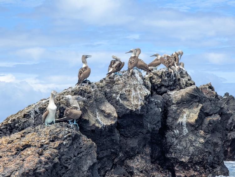 Frühmorgens taumelten wir schlafgetrunken zum Hafen für unsere Tour. Mit einem Wassertaxi (1$ zusätzlich zum Tourpreis!) wurden wir zu einer kleine Fähre gebracht. Wir legten pünktlich ab und rasten zwei Stunden über die Wellen. Im Hafen von Puerto Villamil mussten wir nochmals kurz auf ein Wassertaxi (1$) umsteigen und suchten dann lange nach unserem Tourguide in der Masse von Tourist:innen und Guides. Wir stiegen direkt in ein Boot, welches uns zu den Tintoreras Inseln brachte. Dort spazierten wir über ein Inselchen, das hauptsächlich aus Vulkangestein bestand. Wir sahen viele Leguane und an einem kleinen Strand Seelöwen im Schatten unter den Mangroven und spielend im Wasser. In einem Kanal sahen wir eine Schildkröte und einen Weisspitzenriffhai im warmen Wasser entspannen. Die Leguane auf den Galapagos-Inseln können bis zu 20m tief tauchen und fressen Algen unter Wasser. Danach legen sie sich auf Felsen, um sich in der Sonne aufzuwärmen.