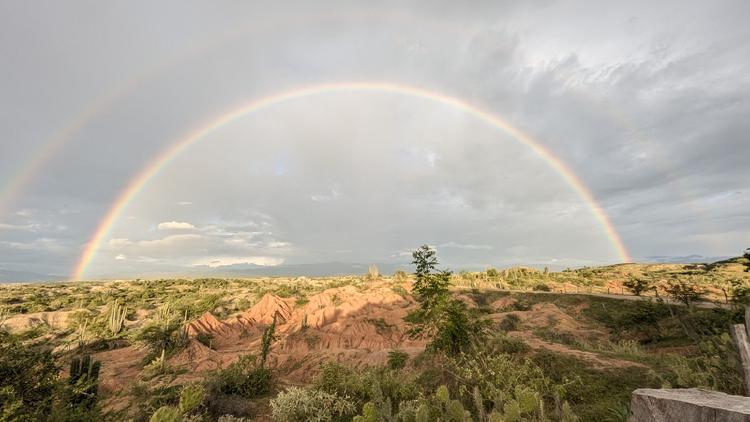 Das Wetter spielte etwas verrückt, als wir zur Sonnenuntergangszeit im Casa de Campo los Cactus ankamen. Durch den leichten Nieselregen, der in der Hitze sehr willkommen war, entstand ein gigantischer, doppelter Regenbogen. Wir konnten uns kaum satt sehen und freuten uns, dass uns die Natur an einem Freitag, dem 13. solch ein Spektakel bescherte.