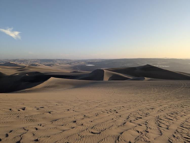 Nur eine Stunde mit dem Bus entfernt liegt die 500'000-Einwohner-Stadt Ica. Wir übernachteten am Nationalfeiertag dort, was bedeutete, dass die einzigen zwei vegetarischen Restaurants geschlossen waren und wir uns mit einer maximal mittelmässigen Pizza zufriedenstellen mussten. Am nächsten Morgen deckten wir uns in einem Supermarkt mit Snacks für die nächste Busfahrt ein und schnippelten Gemüse in unsere Tupperboxen. Am Nachmittag fuhren wir dann im Tuktuk in die Oase Huacachina. Dort hatten wir eine Sandboarding-Tour gebucht. Wir bekamen Ski-, respektive Snowboardschuhe, ein Board, ein Paar Ski mit Stöcken und Helme. Damit liefen wir über die erste Düne zu den bereitstehenden Buggys.